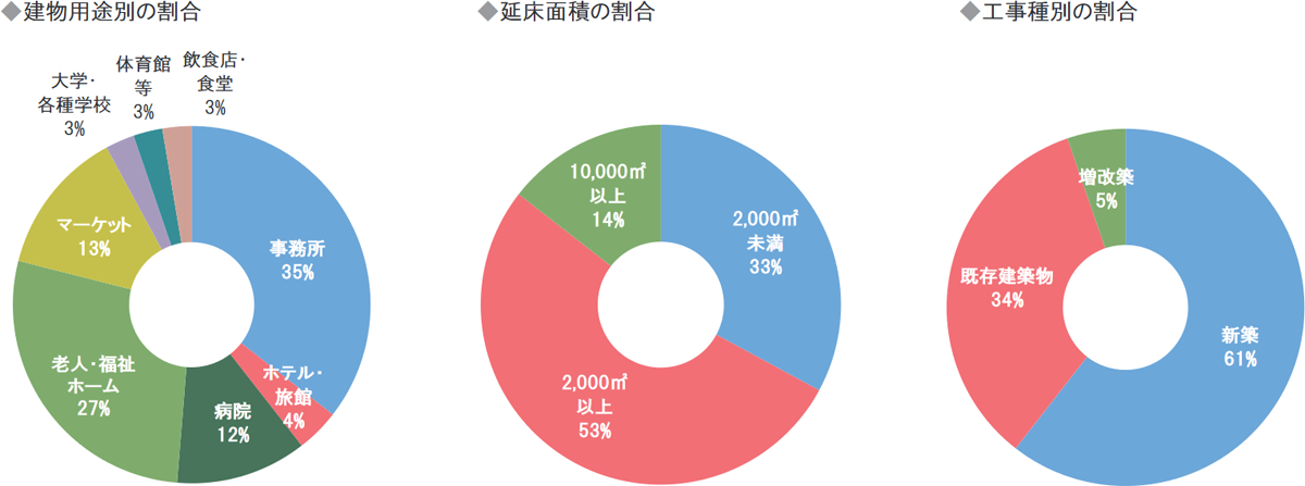 採択事業は、建物用途別の割合でみると、事務所が35%、老人・福祉ホームが27%と全体の60%以上を占めた。地域区分では、5~7地区に採択事業が集中した。延べ床面積の割合は2000m2以上が約半数となり、工事種別は新築が61%だった。