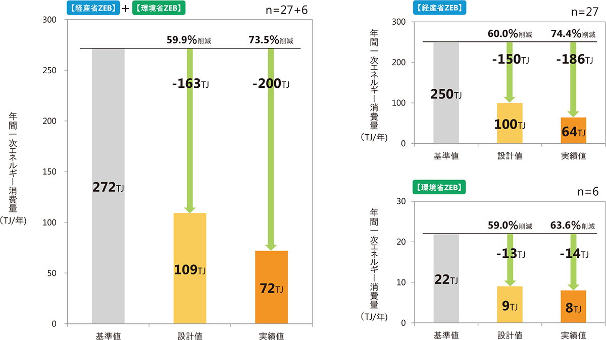 分析対象33件の基準値、設計値、実績値、それぞれの総量をみると、年間1次エネルギー消費量は、設計値109TJに対し実績値は72TJとなった。基準値に対する実績値の削減率は、設計値に比べて13ポイント以上高い73.5%だった。