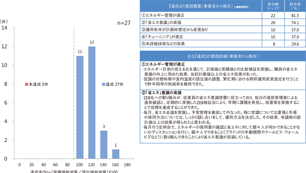 事業者からは達成の理由として、「エネルギー計測の見える化が省エネ意識向上につながった」という声や、「空調切り替え時期や室温の設定値の調整、照明運用設定が奏功した」「省エネ会議を実施し予実管理を徹底した」などの報告があった。