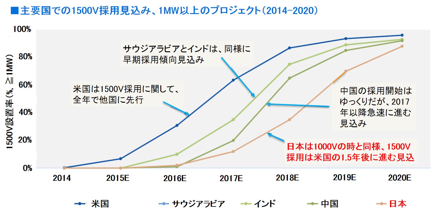 アメリカ・ヨーロッパでは、既に大規模太陽光発電所に1500Vの太陽電池モジュールの導入が進んでいる。