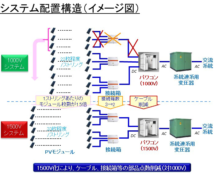 高電圧化が可能になったことで、太陽光モジュールの直列接続枚数を増やすことができ、結果、電力損失を減らしてシステム効率を向上させられる。また、接続箱の台数や、送電ケーブル長を減らすことができるため、導入コスト、ランニングコストの削減にもつながる。
