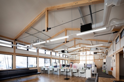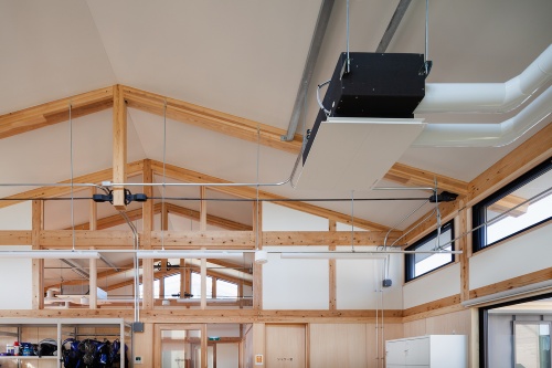 切り妻屋根は梁間の両端で支持する張弦梁の架構とし、室内側に柱のないスパン8.4mの大空間を確保した。将来の保守と更新のしやすさを考えて天井を張らず、暖冷房や換気などの設備機器を露出させた。登り梁(のぼりばり)の集成材を除き、躯体には市場に流通する製材を用いた。架構のつくりも使用する木材の寸法もできるだけ統一し、工事費と工期を抑えた。