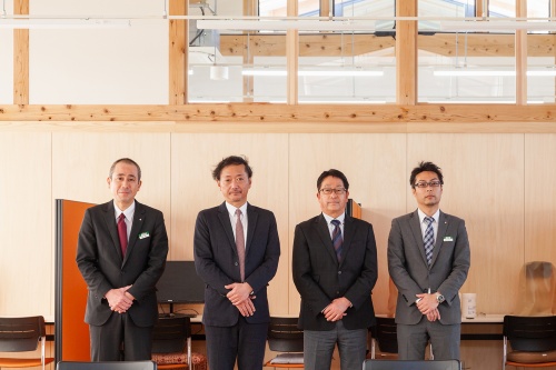 左からナイス木造建設事業本部木構造事業部の遠藤雅宏事業部長、インター・アート・コミッティーズの皆川充代表、かなで建築設計の須田和正代表、ナイス木造建設事業本部木構造事業部工事部の松崎勇太氏(写真:吉田 誠)