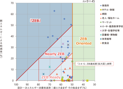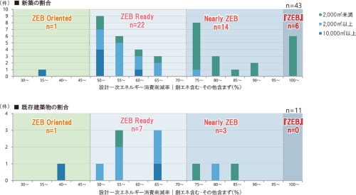 ZEB達成度の拡大図。設計1次エネルギー消費削減率(創エネ含まず、その他含まず)は50〜60%の間に多く分布しており、 創エネルギーによる削減率は0〜5%の間に多く分布している(資料:環境共創イニシアチブ)