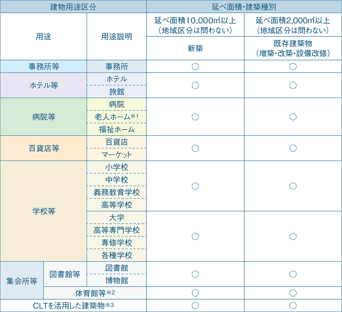 ※3:建物用途が採択枠一覧表の建物用途区分に含まれ、直交集成板(CLT)を構造耐力上主要な部分に用いつつ、開口部を除く外皮面積へのCLT使用割合が15%以上である建築物(資料:環境共創イニシアチブ)