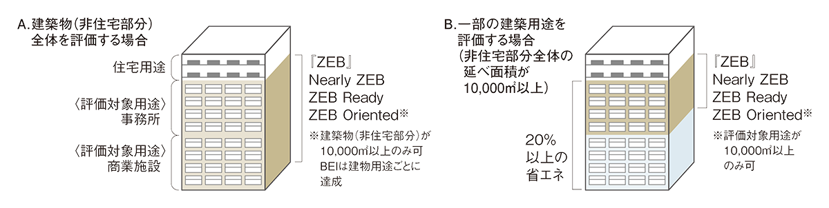 複数用途建築物におけるZEBの評価。対象はAとBのいずれか、または両方とする(資料:環境共創イニシアチブ)