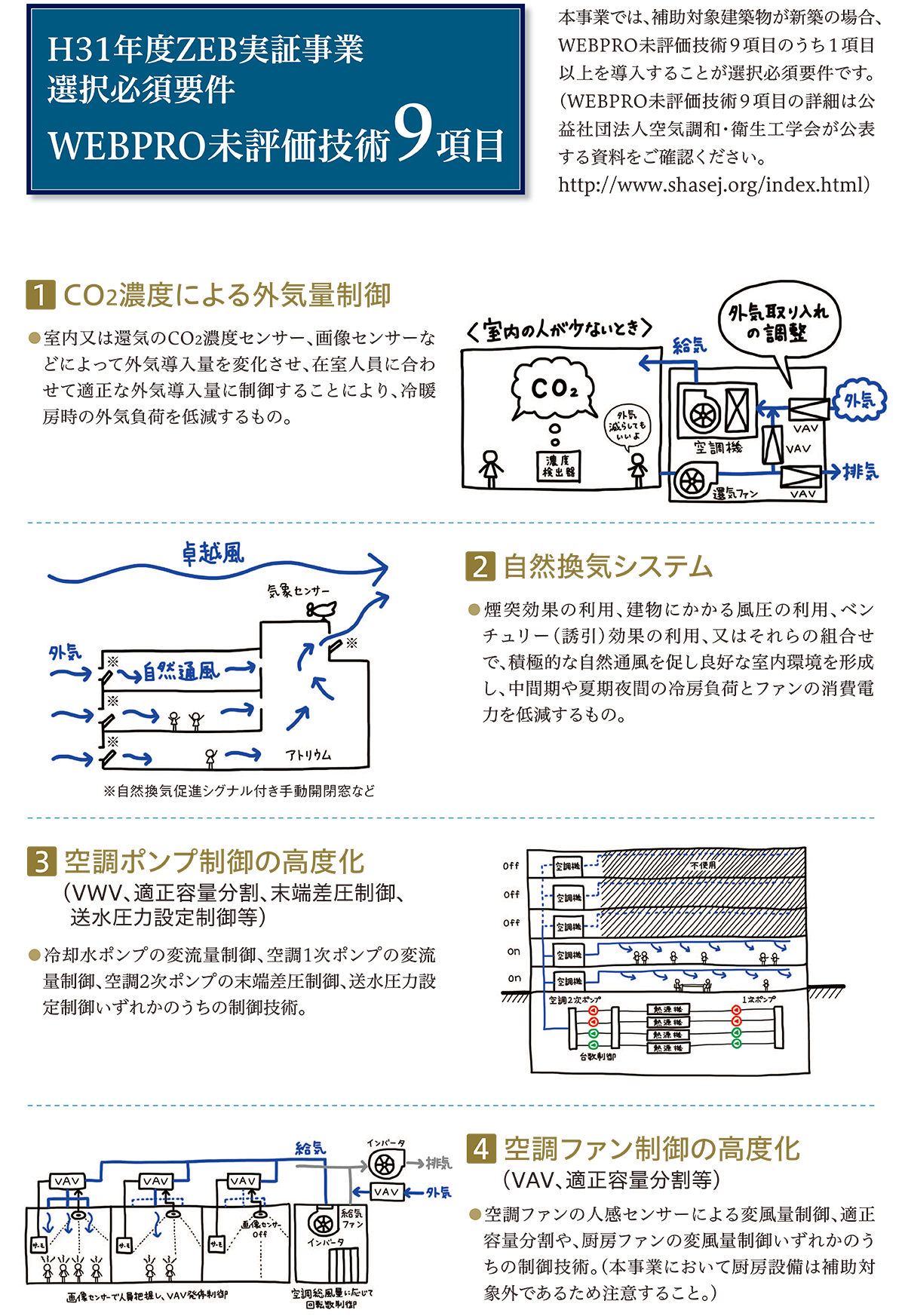 交付要件にも変更点がある。2019年度から、エネルギー消費性能計算プログラム(WEBPRO)の未評価技術の9項目のうち1項目以上を導入することが必須要件となった。併せて、未評価技術の効果を含む計測、記録を行うBEMSの導入も必須となる。