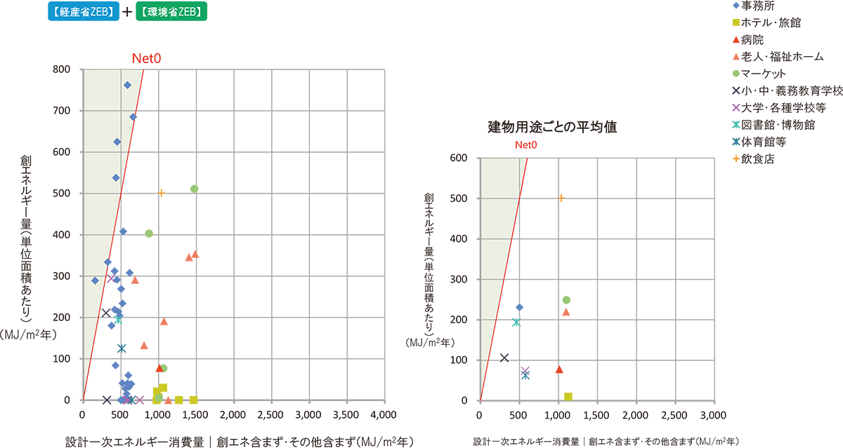 設計1次エネルギー消費量と創エネルギー量(単位面積あたり)の関係を示す。設計1次エネルギー消費量はパソコンやプリンターといったOA機器、冷蔵ケースなどによる「その他1次エネルギー消費量」を含まない(資料:環境共創イニシアチブ)