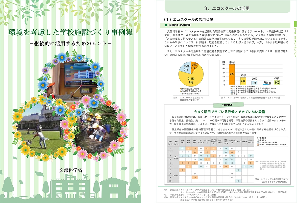 文科省は、環境を考慮した学校施設(エコスクール)の環境教育への活用方策などで具体的、専門的な検討を行うため、19年1月から「学校施設の在り方に関する調査研究協力者会議」において「環境教育に活用できる学校施設検討部会」を設置。20年3月には同部会が中心となり、「環境を考慮した学校施設づくり事例集−継続的に活用するためのヒント−」を公開した。太陽光発電をはじめとする再生可能エネルギー設備導入にも言及している。事例集は文科省のホームページからダウンロードできる。
