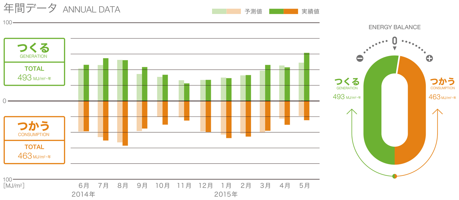 完成後の運用では、最初の1年間のエネルギー消費量463MJ/m2・年に対して創エネルギー量が493MJ/m2・年となり、建物単体での年間エネルギー収支ゼロを実現した。以降も5年間エネルギー収支ゼロを達成している。