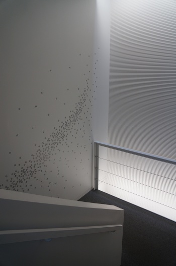 花のイメージを散らした階段室まわり。WELL認証を取得する際に視覚的な仕掛けとして追加した(写真:守山 久子)