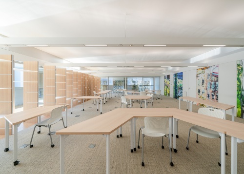 19年5月、建物利用者の健康に関する米国の認証制度「WELL Building Standard(WELL認証)」で最高ランクの「プラチナ」を取得した。「新築/既存建築物全体」の認証区分では世界初となる。申請に向け、前述した改修工事に先駆けて、階段室の壁面に花を散らしたデザインを施した。利用者に階段の上り下りを促す仕掛けだ。そのほか、健康を増進するツールとして昇降デスクや自転車型トレーニングマシン、ハンモックを導入した。