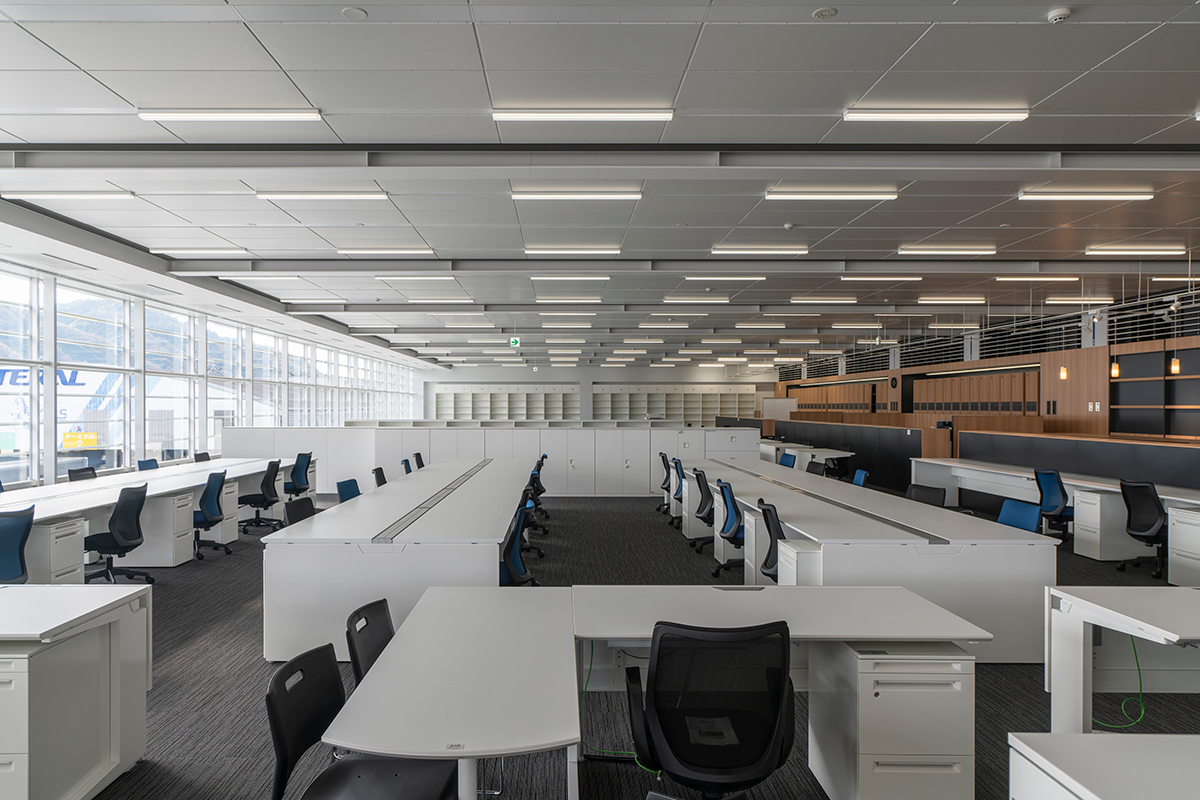 今別府 結果的にはとても良い建築になりました。一般にZEBは開口面積を抑えた壁の多い建物になりやすいのですが、今回は開口の大きな明るい執務空間としながらNearly ZEBを実現できました。2階の執務エリアは20×50mの大空間で、しかも階高が高い。階高を2700mm程度にして気積を抑える場合が多いのに対し、今回は既存棟の階高にそろえたため2階の階高が3500mmあります。