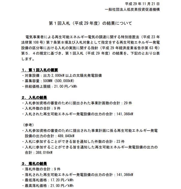 図 メガソーラーの第1回入札は低調な結果に終わった(出所:一般社団法人低炭素投資促進機構)