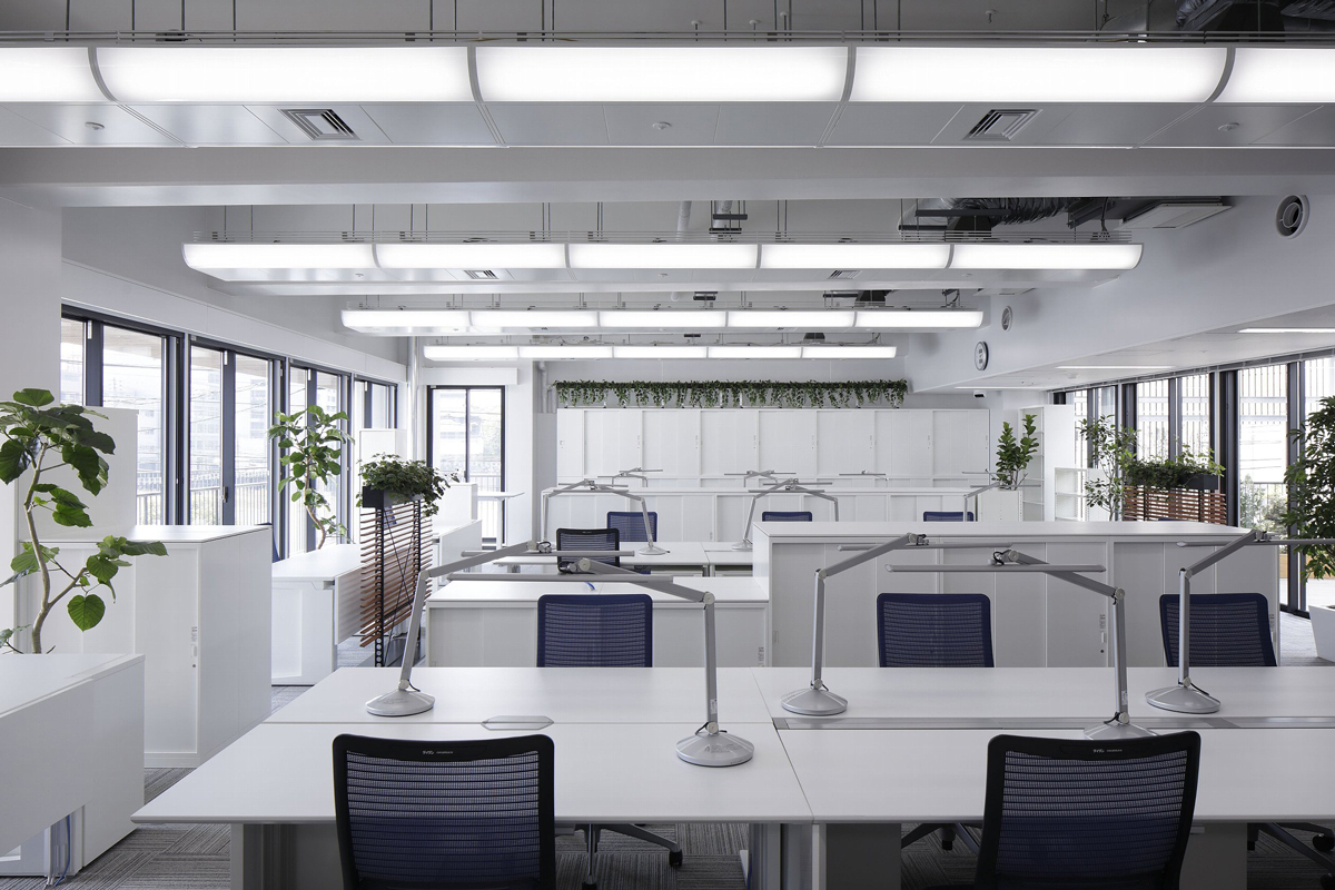 事務室では、空調と照明それぞれにタスク・アンビエント方式を採用した。室内全体を対象としたアンビエントの空調と照明を担うのは、ダイダンが開発した空調吹き出し口と照明を一体化したユニット「シーリングフリー」だ。空調ダクトの役割を担う筒の両側にLED照明を組み合わせた製品で、躯体からユニットをつり下げれば天井仕上げを不要にすることもできる。