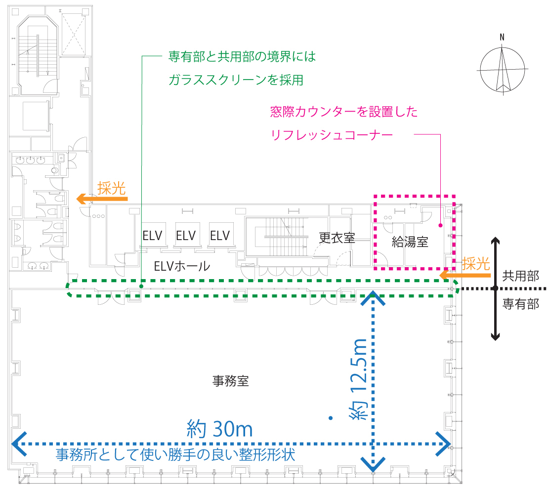 照明は、大成建設が東光高岳(東京・江東)と共同開発したシステム「T-Zone Saver」を導入した。熱感知により、事務室のエリアごとの在不在に応じた照度コントロールを行う。