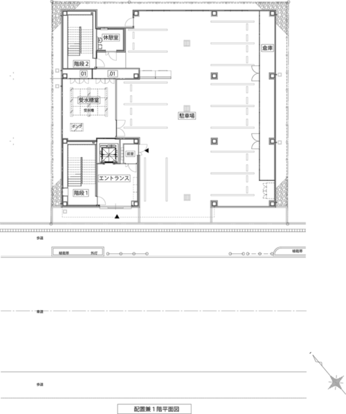 建物は、間口24.5m、奥行き22.5mのシンプルな箱型形状とした。1階は駐車場スペース、2階から5階までの4フロアに8社分のテナントスペースを用意した。5階建てのビルが隣接する西北面は開口部を極力減らし、エレベーターや階段室、トイレなどのコアスペースを配置した。