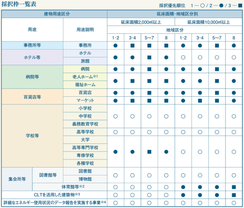 ※3 建物用途が採択枠一覧表の建物用途区分に含まれ、CLTを構造耐力上主要な部分に用いつつ、開口部を除く外皮面積へのCLT使用割合が15%以上である建築物。CLTとは、Cross Laminated Timber(クロス・ラミネイティド・ティンバー)の略で、板の層を各層で互いに直交するように積層接着した厚型パネルのこと。